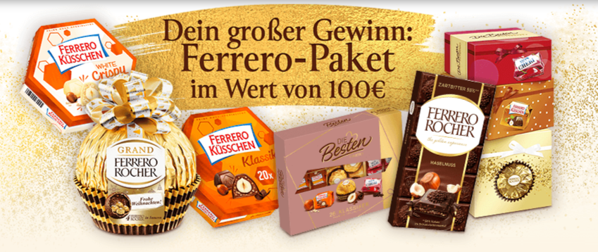 Sei dabei und gewinne mit etwas Glück ein Ferrero-Paket im Wert von bis zu 100 €! Dich erwartet die Chance auf eine süße Überraschung mit Ferrero-Produkten im Gesamtwert von 100 € – ideal zum Naschen, Verschenken oder Genießen mit deinen Liebsten. Mach jetzt mit und sichere dir dieses unwiderstehliche Genuss-Paket!