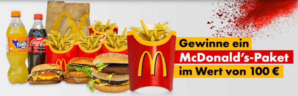 Sei dabei und gewinne mit etwas Glück ein McDonald´s-Paket im Wert von 100 €! Dich erwartet ein prall gefülltes McDonald’s Paket im Wert von 100 € – ideal zum Genießen, Teilen oder Verschenken. Mach jetzt mit und sichere dir oder deinen Liebsten die Chance auf leckere Überraschungen!