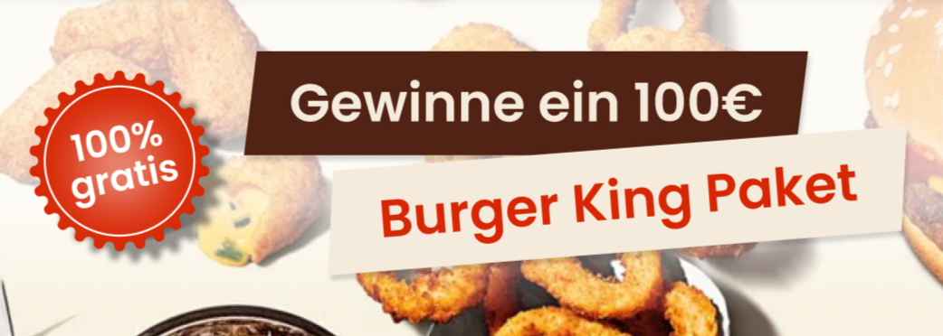 Jetzt mitmachen und ein exklusives Burger-King-Paket im Wert von 100 € gewinnen! Freuen Sie sich auf puren Genuss: Das Burger-King-Paket bietet leckere Gutscheine, Menü-Voucher und kleine Überraschungen – perfekt für Burger-Fans, gemütliche Abende mit Freunden oder als Geschenk für echte Fast-Food-Liebhaber