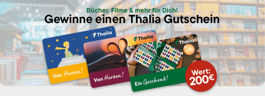 Sei dabei und gewinne mit etwas Glück einen Thalia-Gutschein im Wert von 200 €! Dich erwartet die Chance auf eine riesige Auswahl an Büchern, eBooks, Hörbüchern und tollen Geschenkideen – perfekt für Lesefreunde, Wissbegierige und Kulturfans. Ob für spannende Romane, inspirierende Sachbücher oder schöne Kleinigkeiten – mit diesem Gutschein hast du die freie Wahl. Jetzt mitmachen und dir die Chance auf dieses besondere Lesevergnügen sichern!